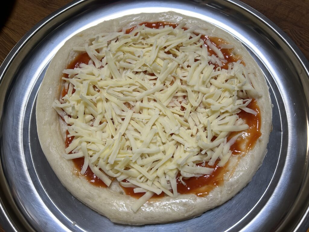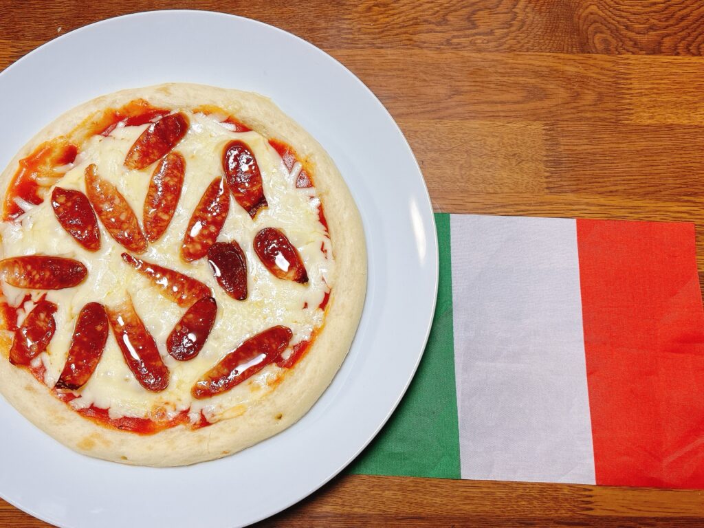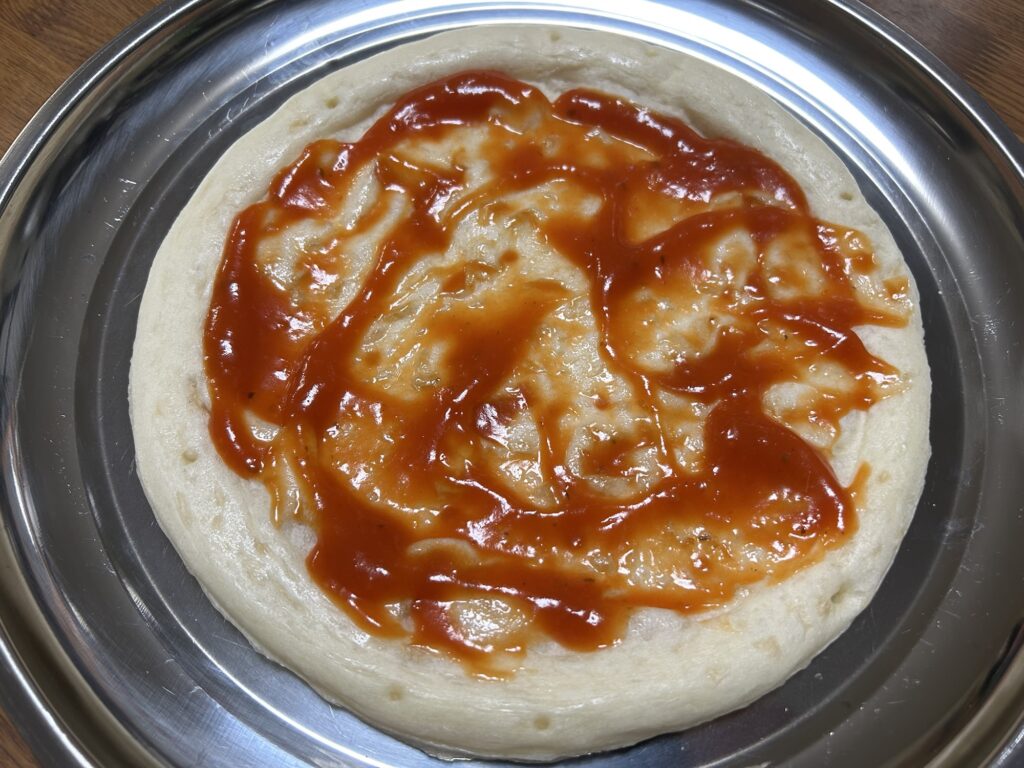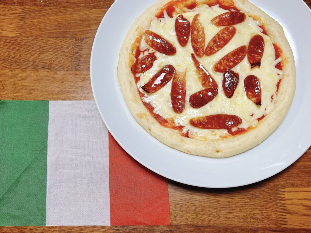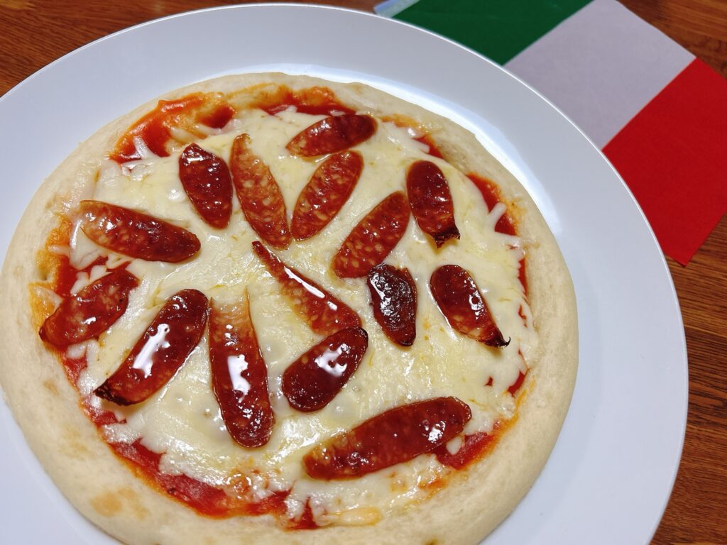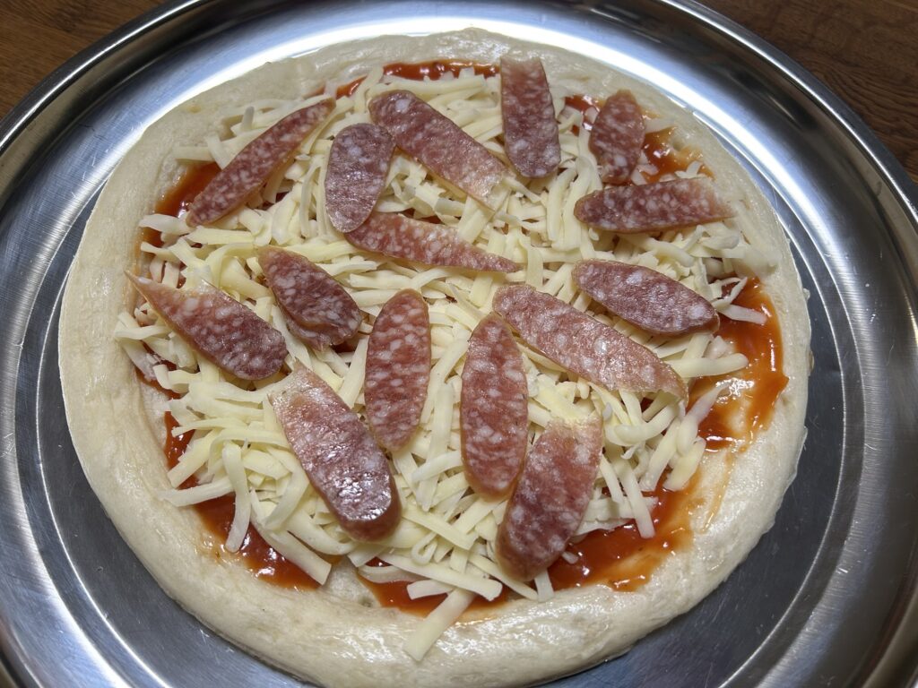 具は色々思案したのですが、売っているピザ生地が小さいので、シンプルにサラミとチーズだけにしました。
