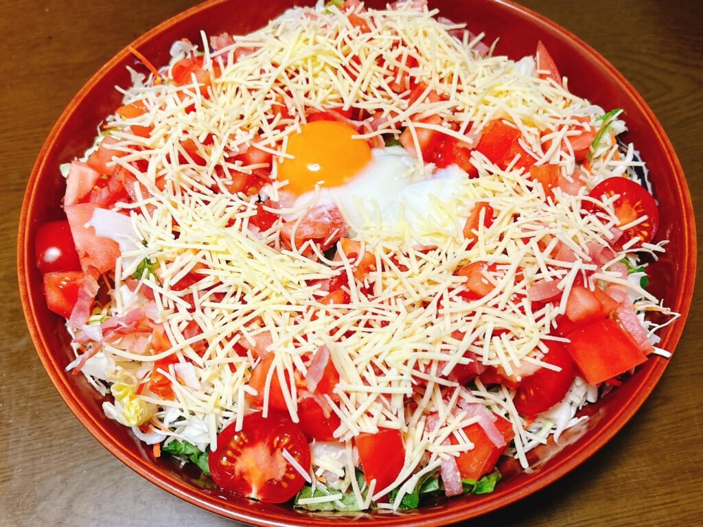 カット野菜をガッツリ盛り、トマトの角切り、チーズを乗せ温玉とシーザードレッシングです。