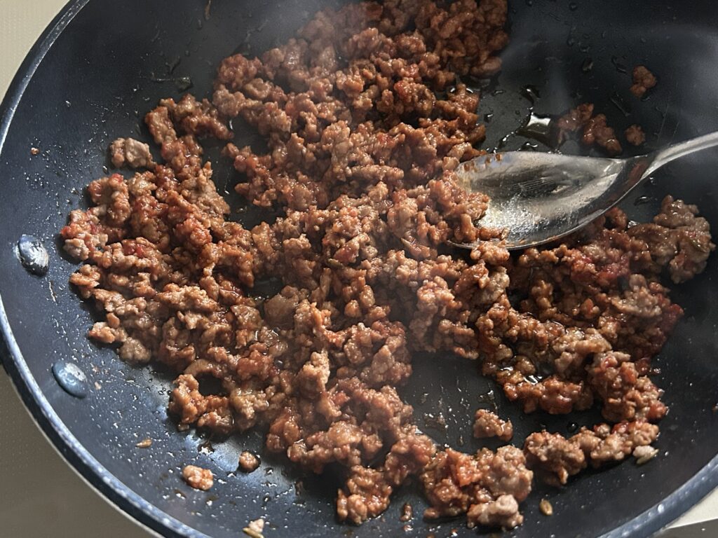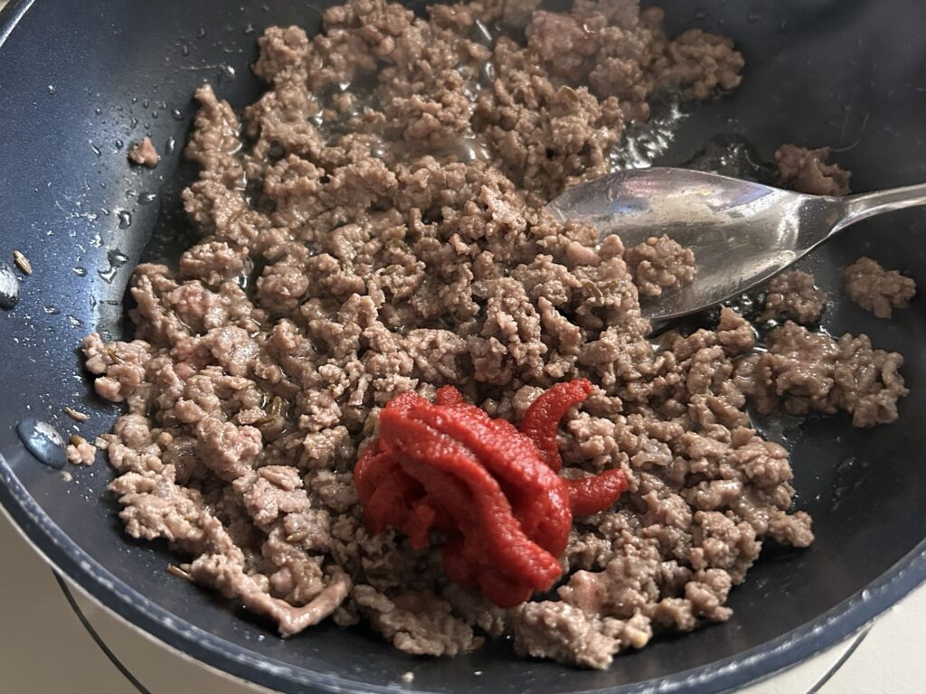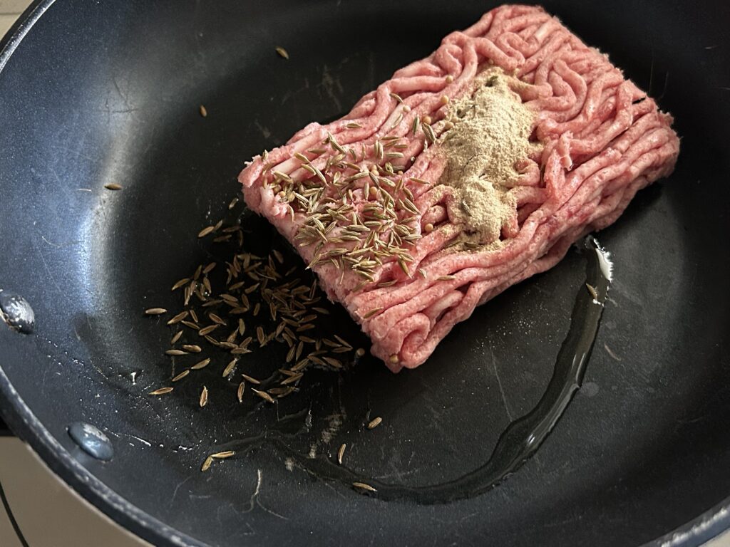フライパンにオリーブを中火で熱し、ひき肉(今回は都合により合い挽き肉を使用)、クミンシード、おろしニンニク(今回はガーリックパウダー使用)を炒める。