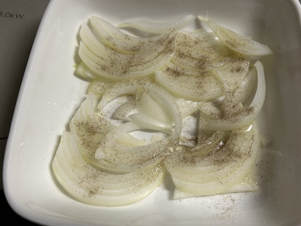 オーブン容器に玉ねぎを並べ、オリーブ油①をたらし、塩コショウを振る。
