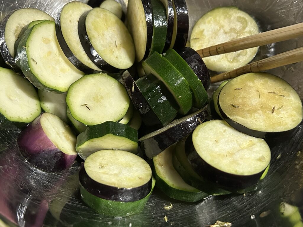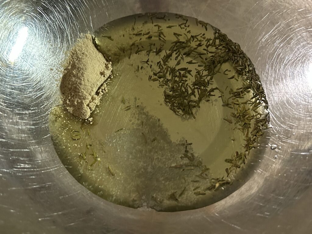 ボウルにオリーブ油②、タイム、塩、ニンニクを混ぜて、