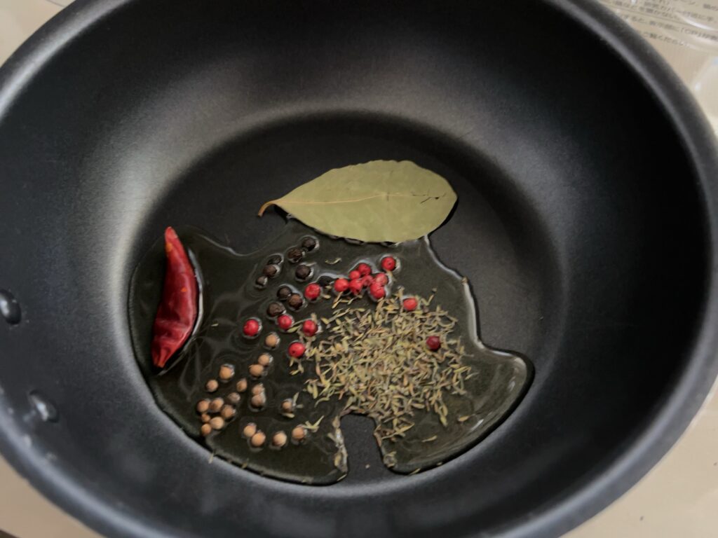 フライパンにオリーブオイルを中火で熱し、スパイスを炒める。