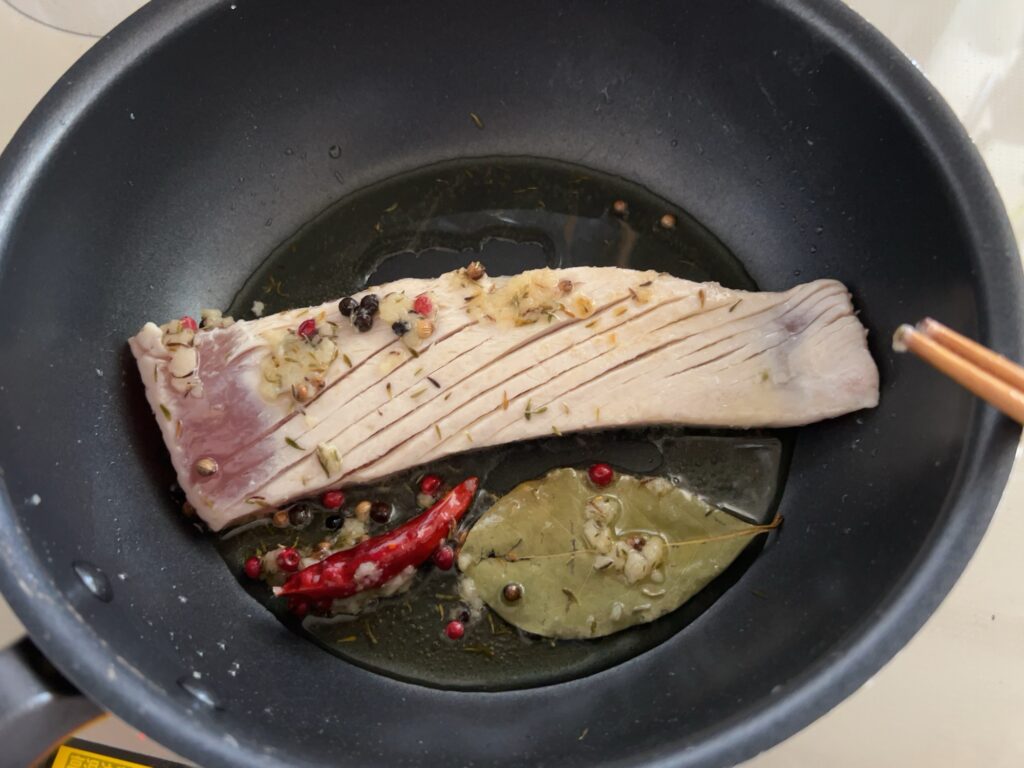中火から弱火でマグロの前面をじっくり焼き、焼き色が付いたら蓋をして火を止めて冷ます。