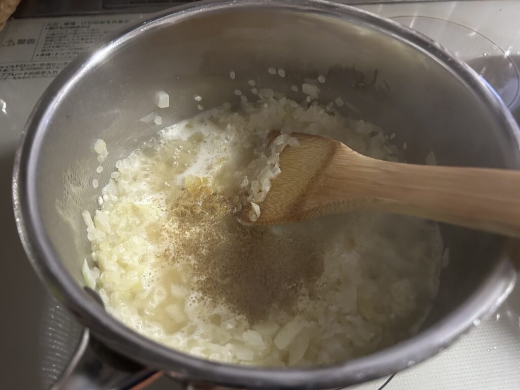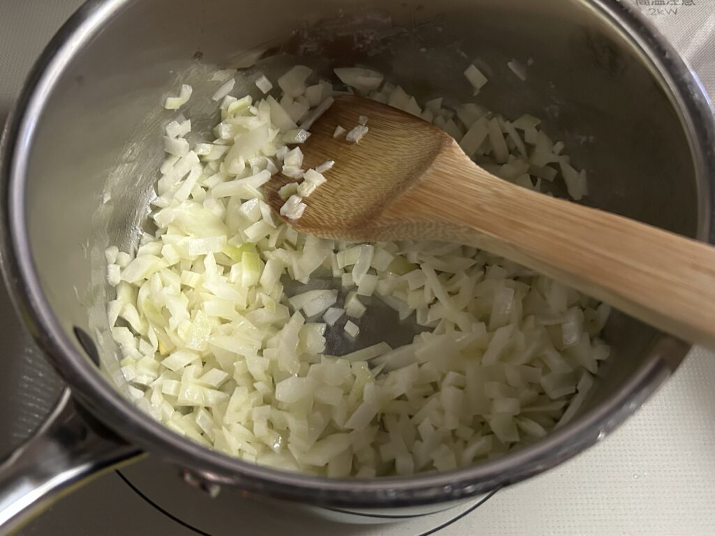 鍋にバターを中火で熱し、玉ねぎを炒める。