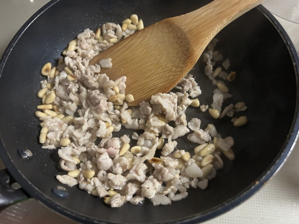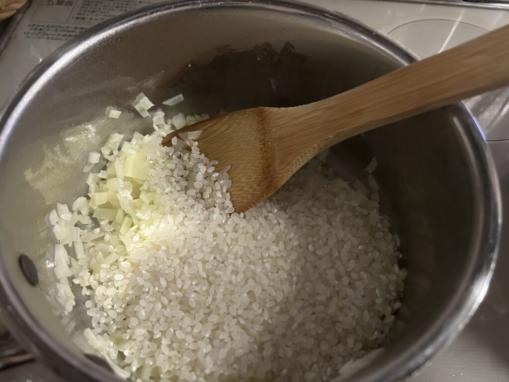 米が全体的に馴染んだら、水、コンソメ、塩コショウを入れ、沸騰したら蓋をして弱火で15分炊く。