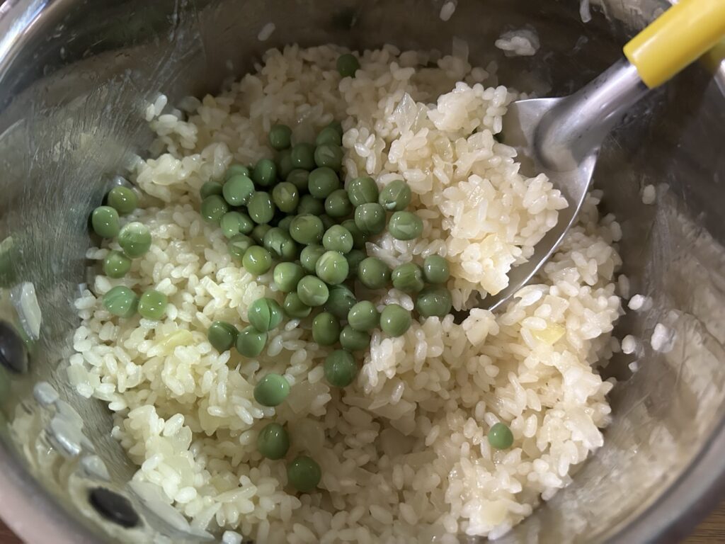 ピラフが炊けたらグリーンピースを入れ、混ぜて蓋をして5分蒸らす。