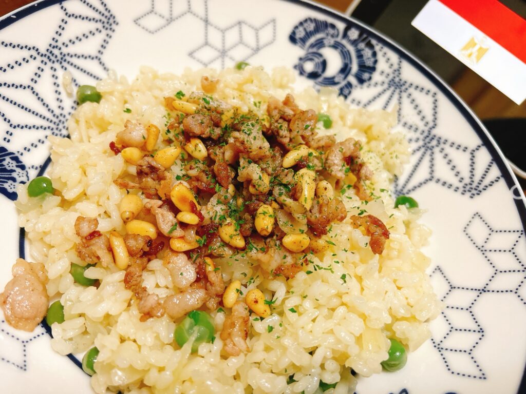ピラフを器に盛り、フライパンの具を乗せて完成。