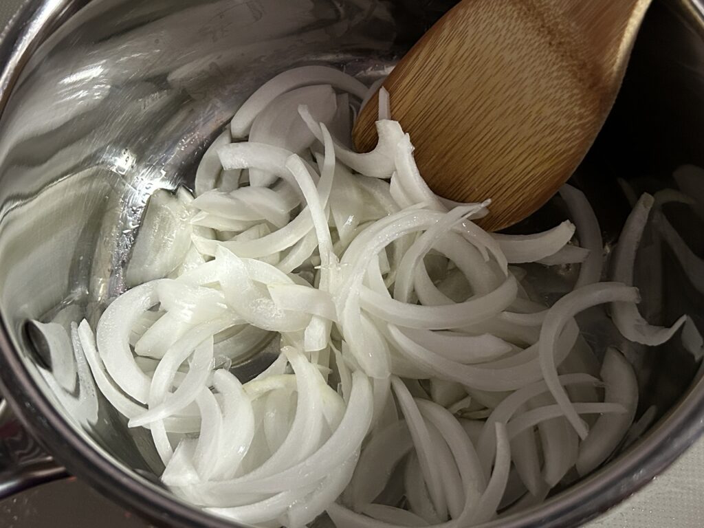 鍋にオリーブオイルを中火で熱し、玉ねぎとにんにくを炒める。