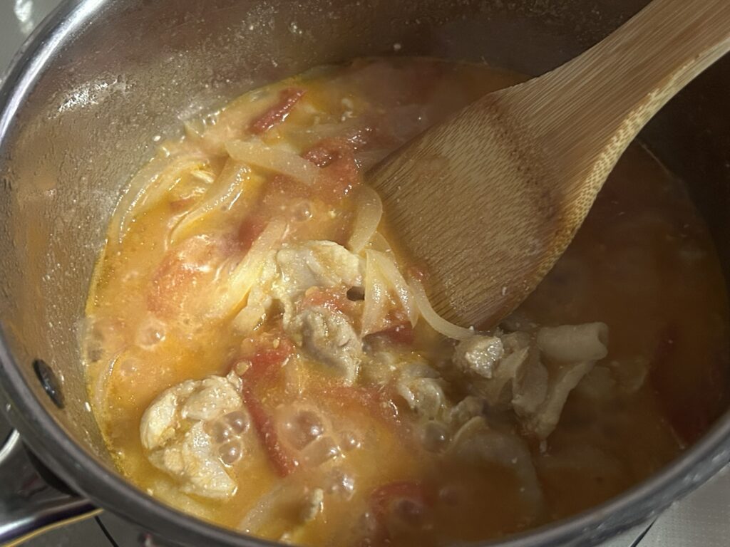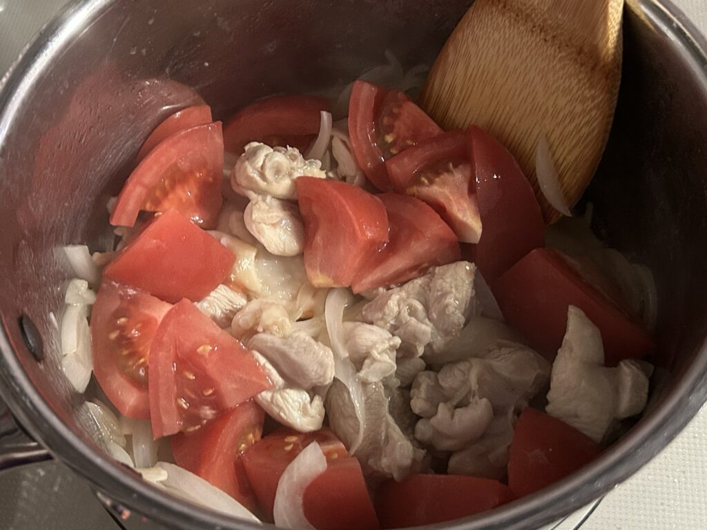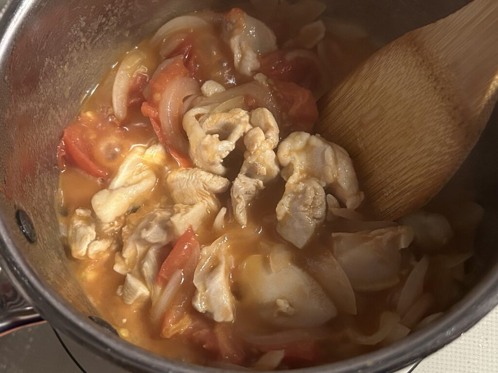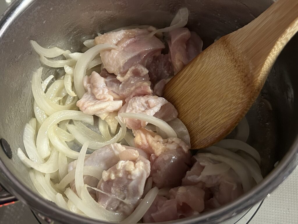玉ねぎが透き通って来たら、鶏肉を炒める。