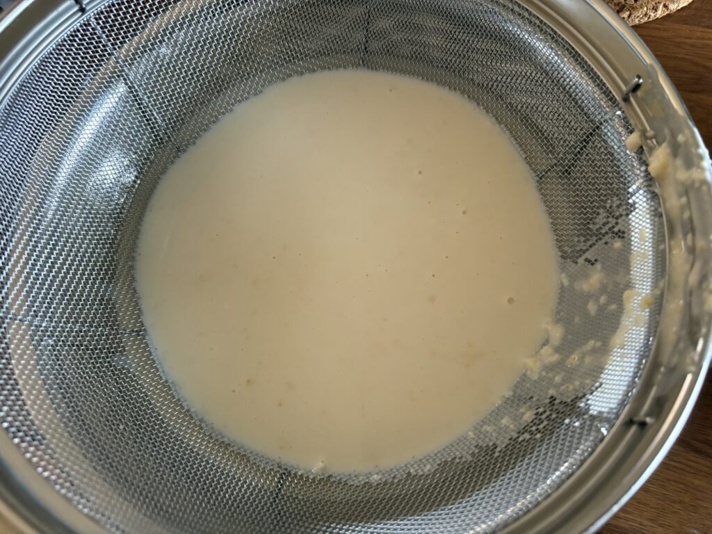 人肌に温めた牛乳を少しずつ入れて泡立て器で滑らかになるまで混ぜたら、ザルで濾す。