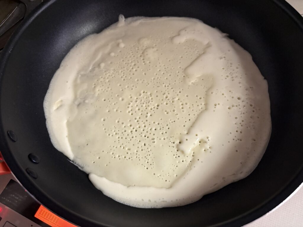 フライパンに油を中火で熱し、生地をお玉1杯いれて広げて焼く。