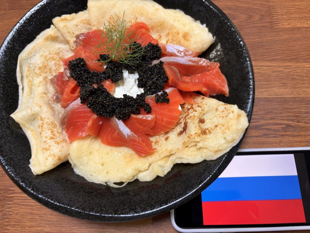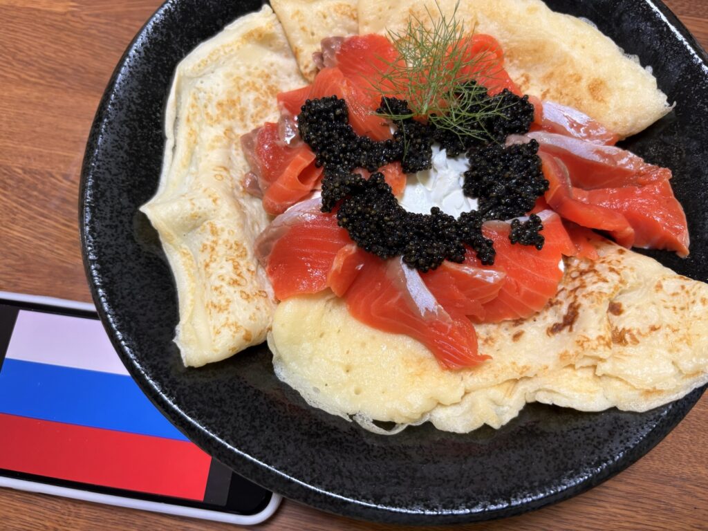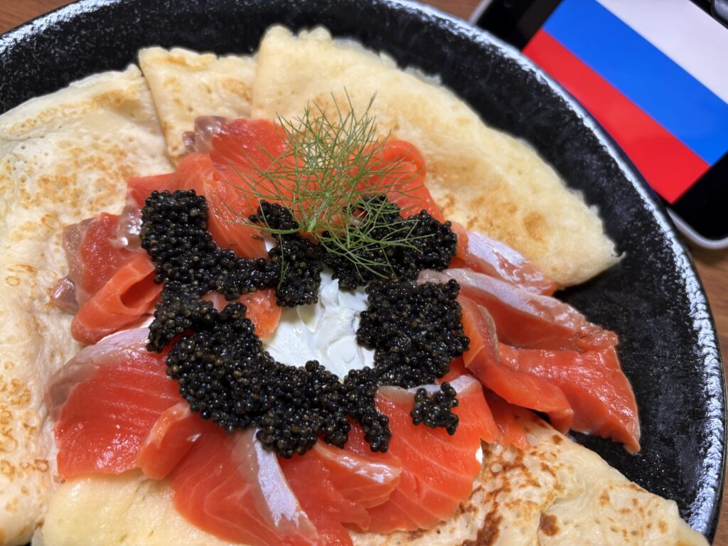 サワークリーム、サーモン、キャビアを乗せて完成。