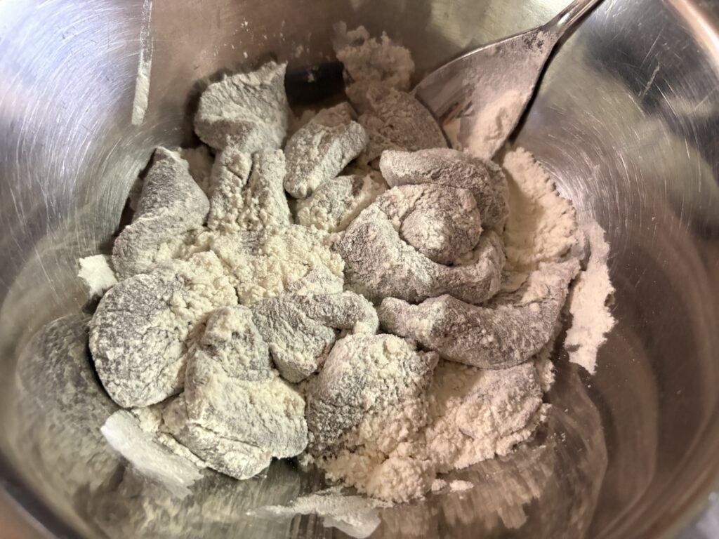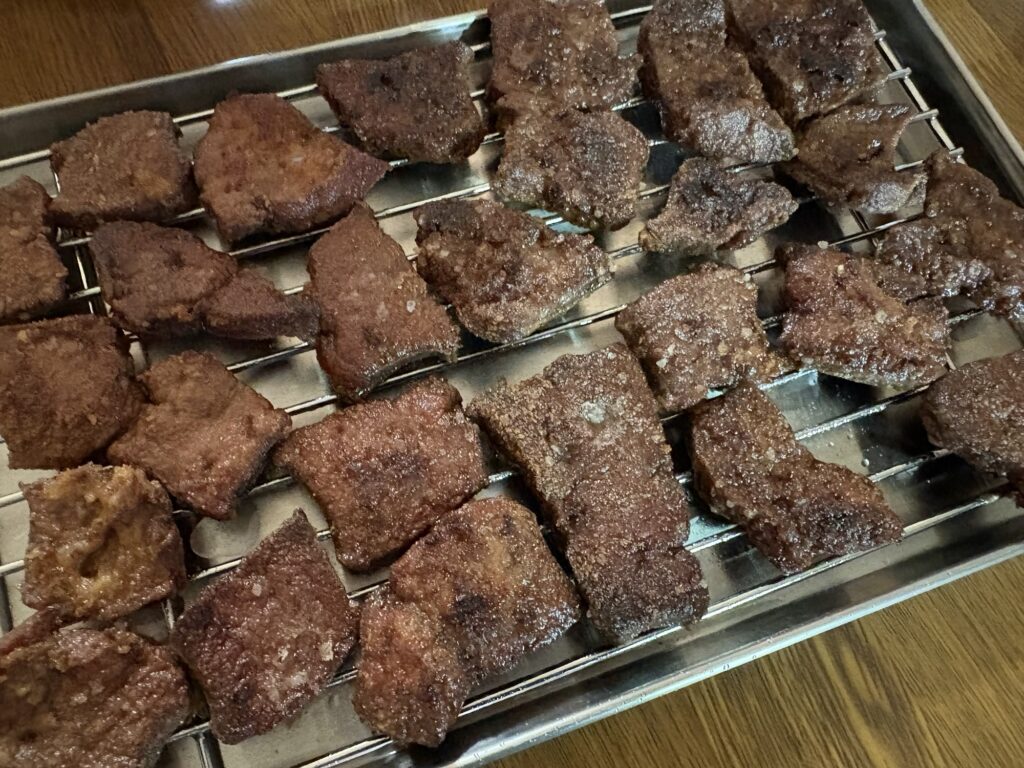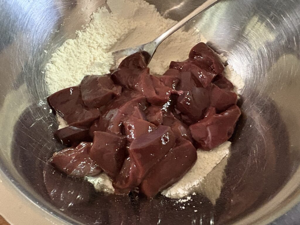 写真を忘れましたが、フライパンに油を中火で熱し、レバーを炒め揚げにする。